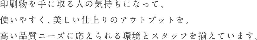 印刷工程のアンカーである製本ラインはとても重要なパート。製本機械に搭載された検査装置に加え、何より製本品質を確かなものにするのは、経験豊かなオペレーターたちのこだわりです。印刷面を傷つけない、汚れのない美しい仕上がりはもちろん、強度や開きやすさにも配慮し、印刷物を手に取る人の気持ちになって製本作業を行います。